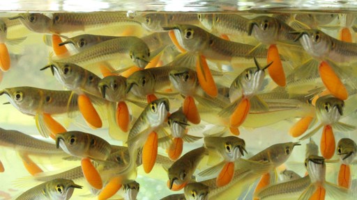 Crías de las especies nativas amazónicas que se producen de manera natural o por inducción hormonal de los peces reproductores de manera artificial. Son la materia prima para la producción de proteína de alta calidad y bajo costo para consumo humano. En el video se puede apreciar el cuidado parental de un macho de la especie arawana con sus crías.